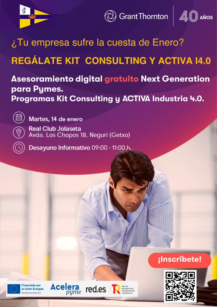 Grant Thornton y el Real Club Jolaseta organizan un desayuno informativo de asesoramiento digital gratuito Next Generation para PYMES centrado en los programas Kit Consulting y Activa I4.0. La jornada tendrá lugar en El Búho, el próximo 14 de enero, de 9 a 11 horas.