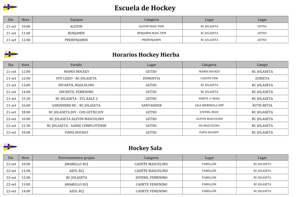 Les informamos a continuación de los horarios de la Escuela de Hockey para el fin de semana del 21 y 22 de octubre. Rogamos máxima puntualidad en la actividad de escuela para la correcta organización de las actividades y el buen desarrollo de estas.
