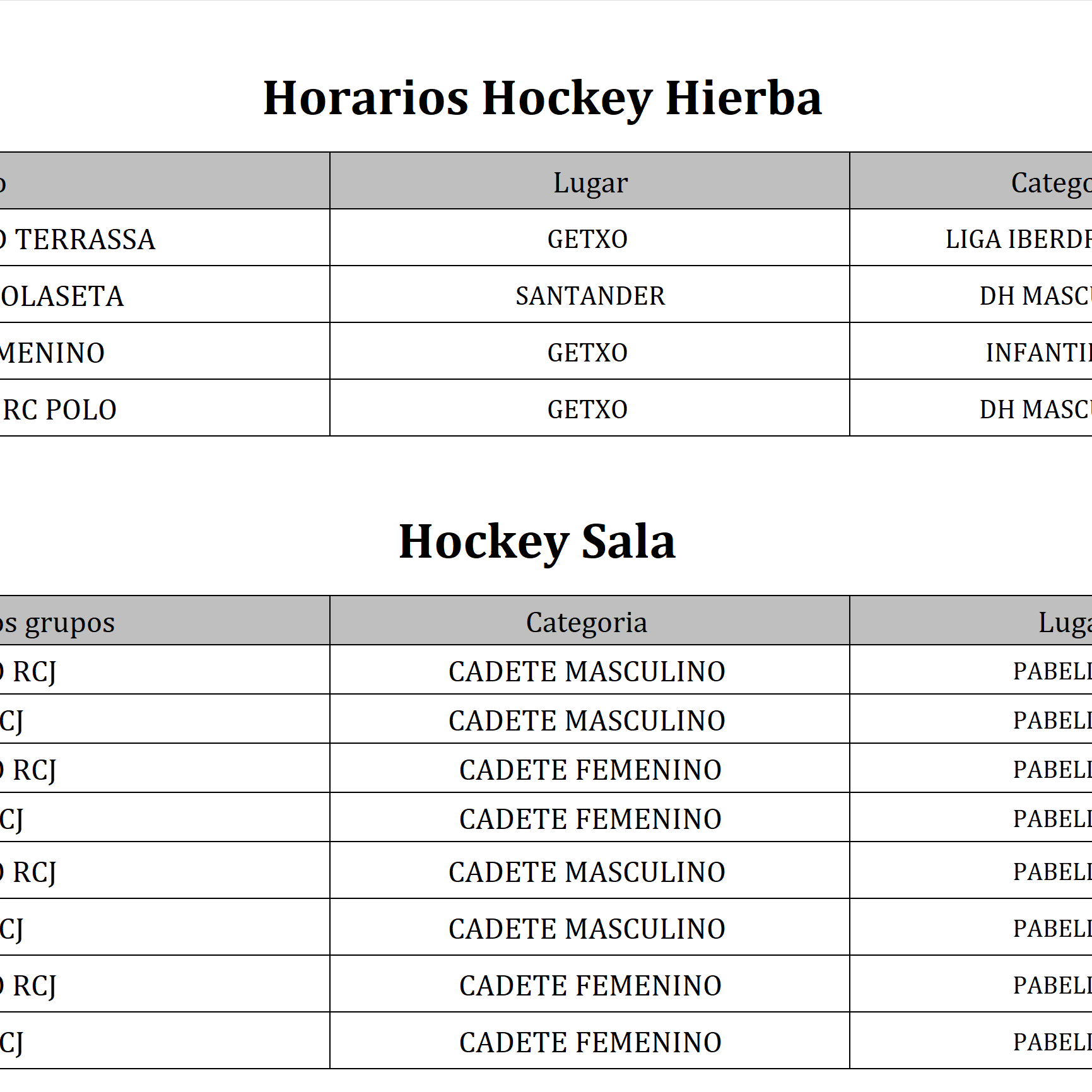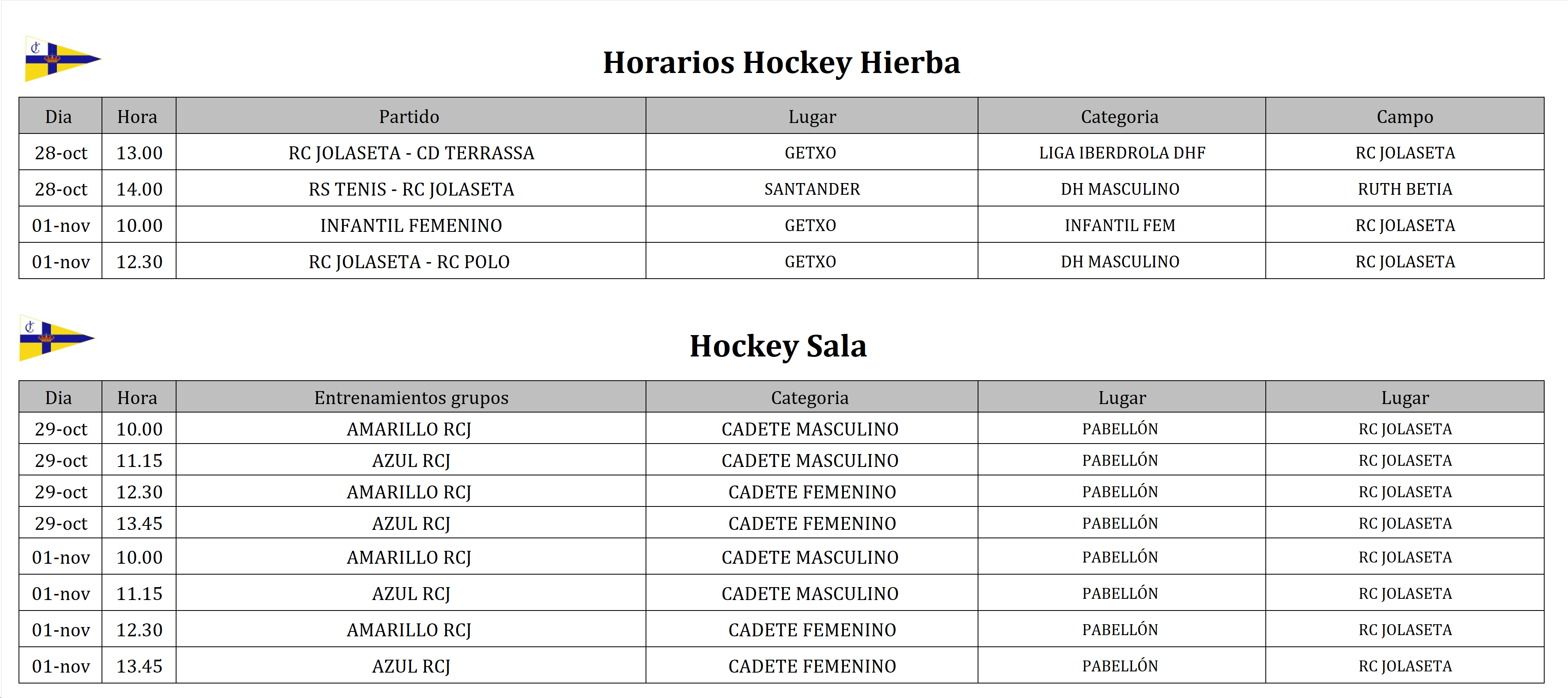 Les informamos a continuación de los horarios de la Escuela de Hockey y de los partidos de División de Honor para el fin de semana del 28 y 29 de octubre. Rogamos máxima puntualidad para las actividades de la escuela para la correcta organización y el buen desarrollo de estas. Así mismo les recordamos que según calendario de escuelas deportivas no tendrán actividad escolar los días 30, 31 de octubre y 1 de noviembre.