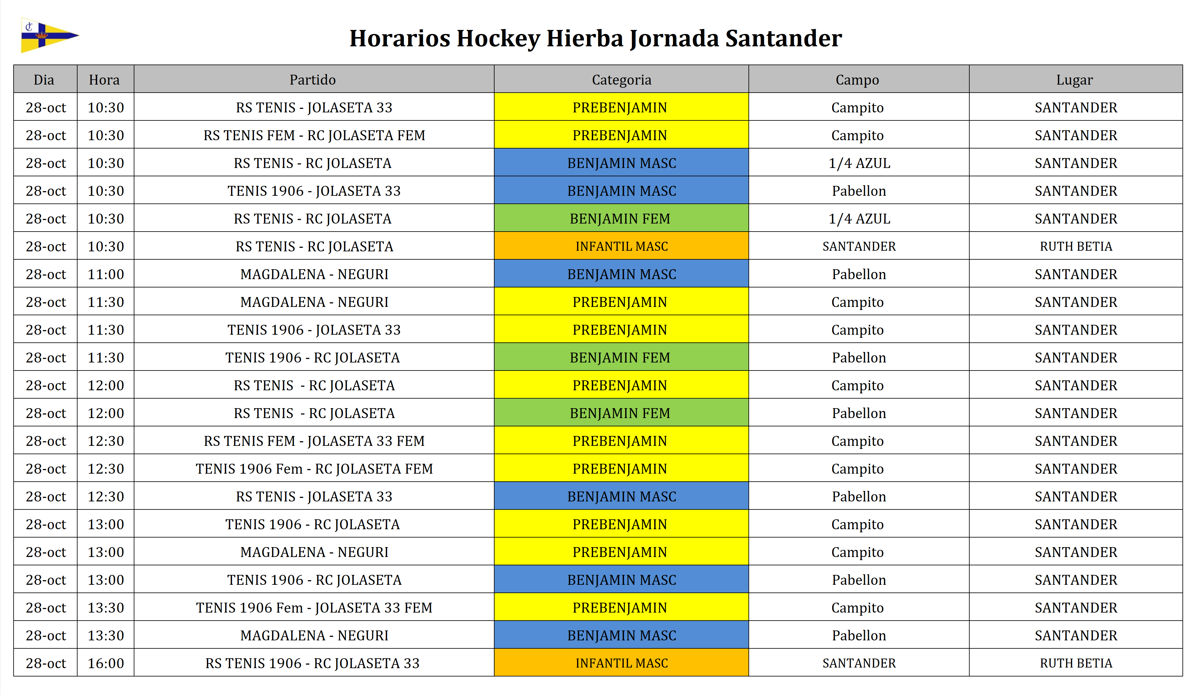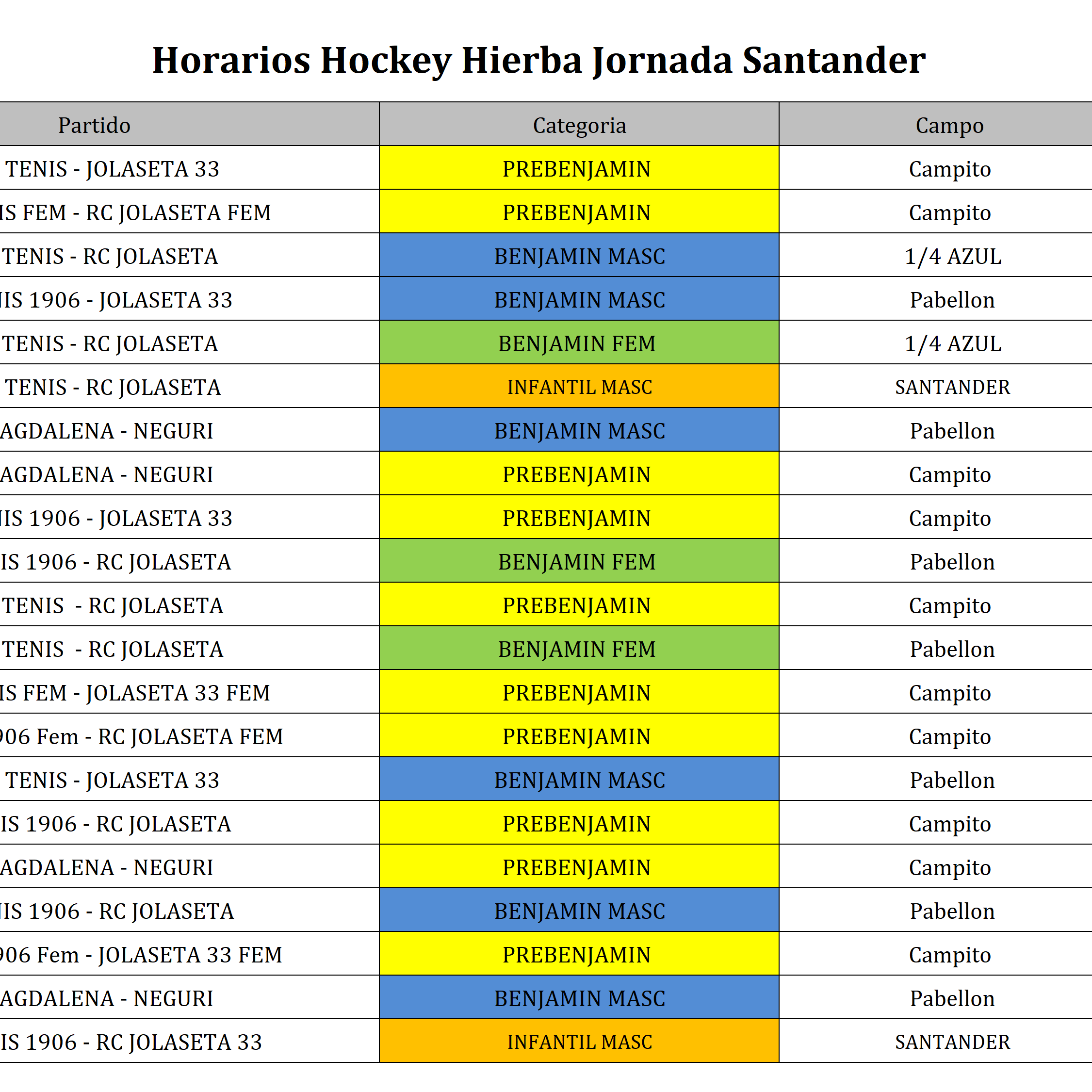Los jugadores que participan en la Jornada de Santander tienen el horario de salida desde nuestras instalaciones el sábado 28 a las 8.30 horas y de retorno desde la Albericia sobre las 15.30 horas a la finalización del partido de la División de Honor Masculina que se enfrenta al RS Tenis de Santander. Los jugadores tendrán una hora estimada de llegada a nuestras instalaciones sobre las 16.30 horas. Por último, los jugadores del equipo Jolaseta 33 infantil Masculino tienen horario de salida a las 11.15 horas desde el Club y retorno posterior al partido sobre las 17.30 horas desde la Albericia. Les recordamos que todos los participantes de la jornada escolar de la Albericia deben llevar la comida de casa.