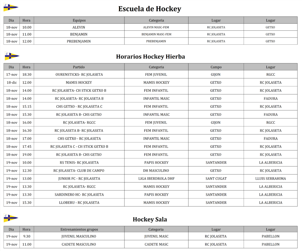 Adjuntamos los horarios de la Escuela de Hockey para el fin de semana del 18 y 19 de noviembre. Rogamos máxima puntualidad en la actividad de escuela para la correcta organización de las actividades y el buen desarrollo de estas.