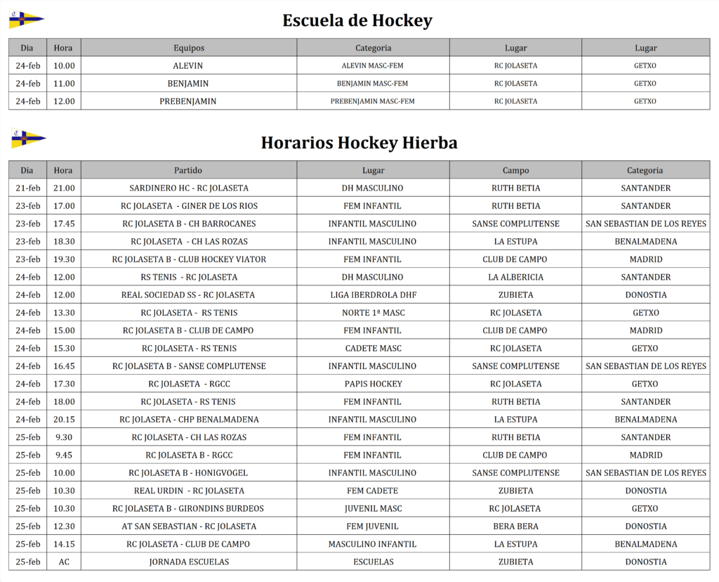 Adjuntamos los horarios de la Escuela de Hockey para el fin de semana del 24 y 25 de febrero. Rogamos máxima puntualidad en la actividad de escuela para la correcta organización de las actividades y el buen desarrollo de estas.