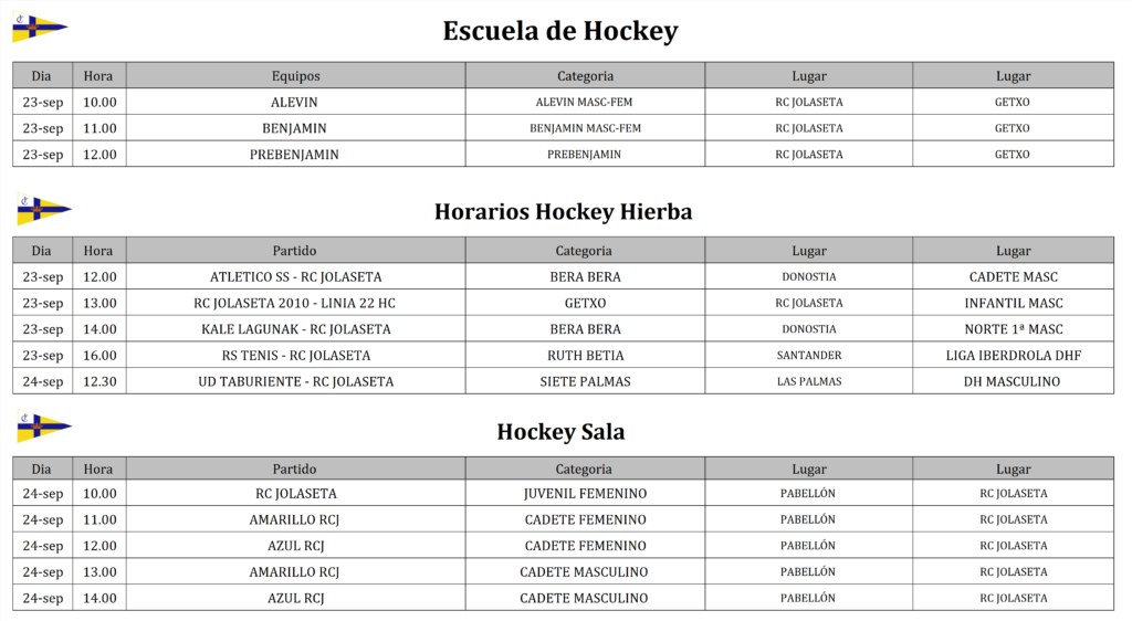Les informamos a continuación de los horarios de la Escuela de Hockey para el fin de semana del 23 y 24 se septiembre. Rogamos máxima puntualidad en la actividad de escuela para la correcta organización de las actividades y el buen desarrollo de estas.