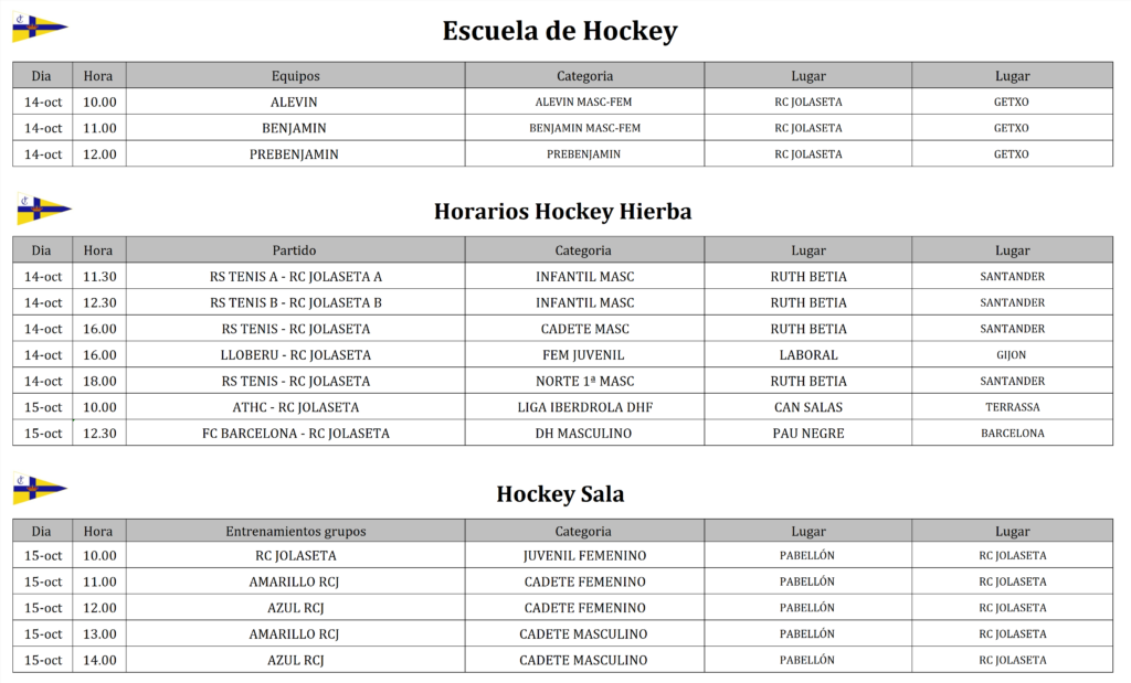 Les informamos a continuación de los horarios de la Escuela de Hockey para el fin de semana del 14 y 15 de octubre. Rogamos máxima puntualidad en la actividad de escuela para la correcta organización de las actividades y el buen desarrollo de estas.