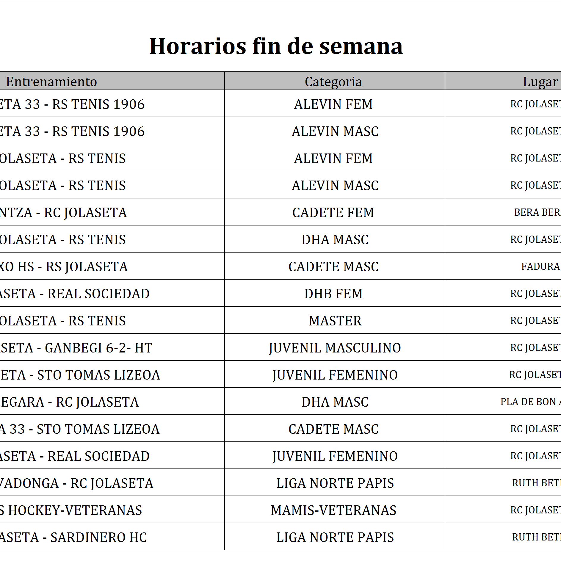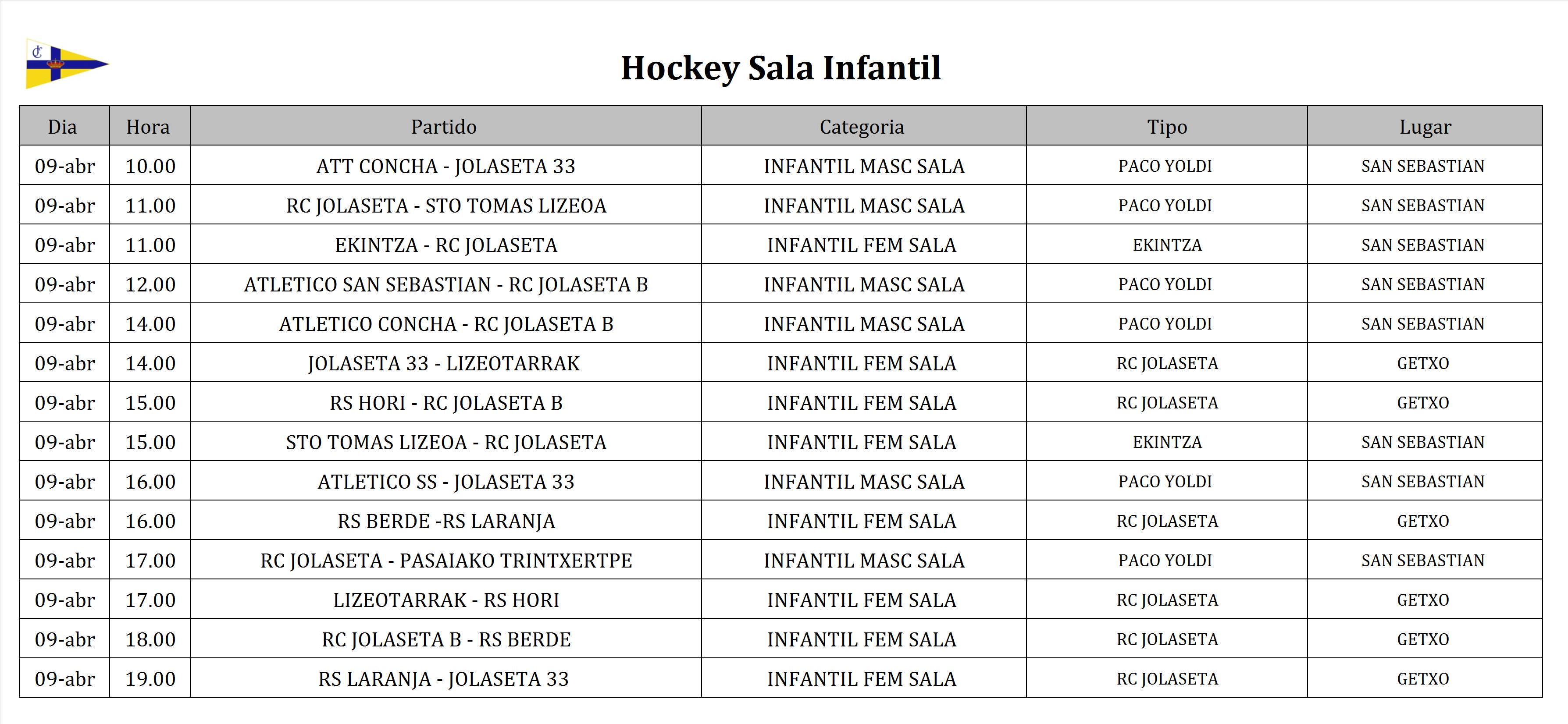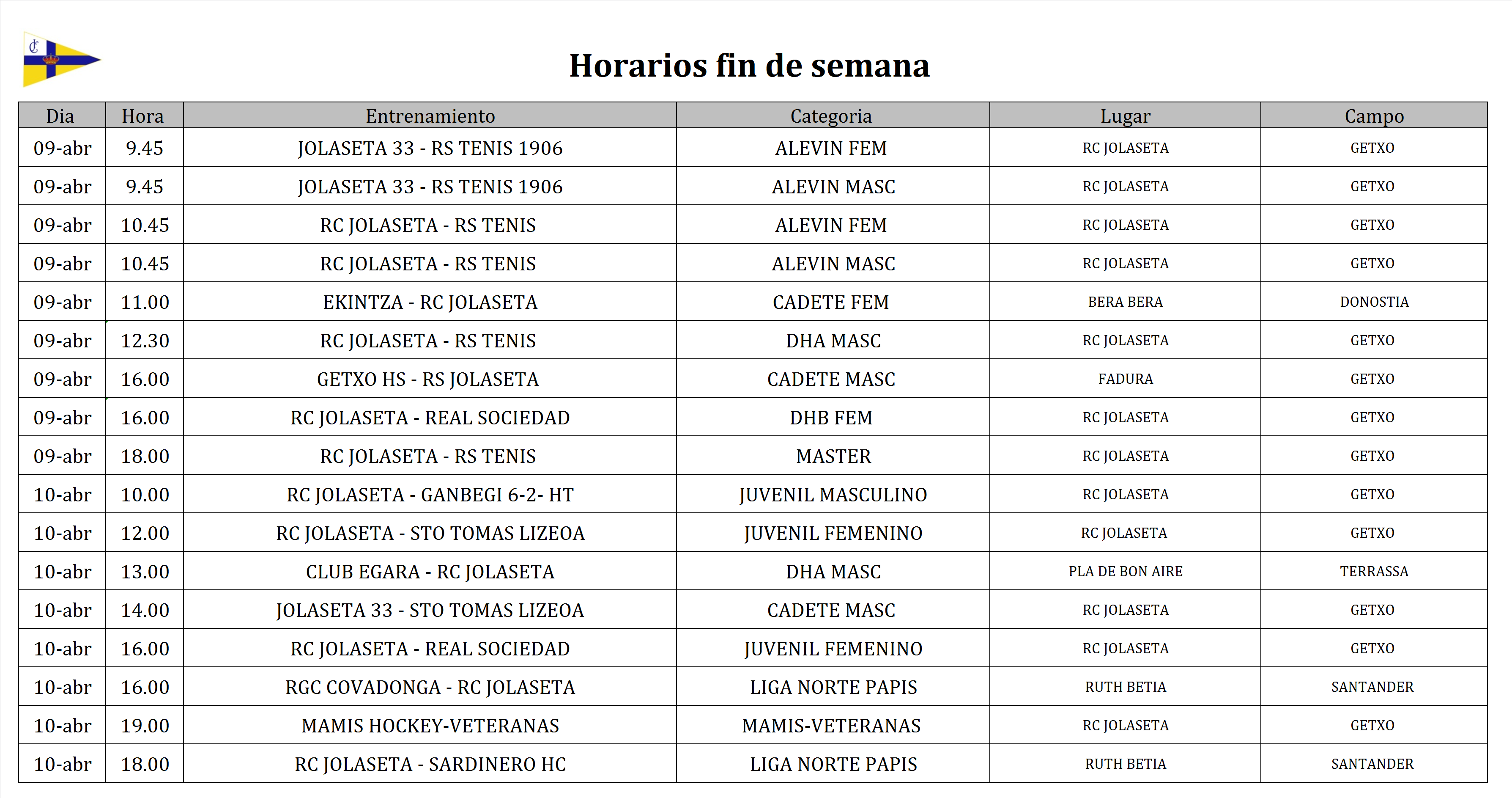 Les informamos a continuación de los horarios de la Escuela de Hockey Hierba para el fin de semana del 9 y 10 de abril. Les rogamos máxima puntualidad para la mejor organización y cumplimiento de todas las actividades, recomendamos estar en el campo 15 minutos antes del inicio de su actividad. La composición de los equipos para l Jornada Alevín contra la Real Sociedad de Tenis de Santander la encontraran en el tablón de anuncios del Club. Les informamos que el bus con destino a Donostia para la categoría Infantil saldrá de nuestras instalaciones a las 8 horas del sábado 9 de abril.