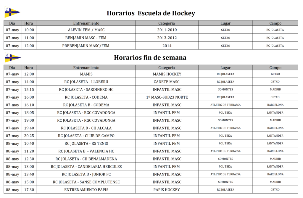 Les informamos a continuación de los horarios de la Escuela de Hockey Hierba para el fin de semana del 7 y 8 de mayo. Rogamos máxima puntualidad para la organización de las actividades.