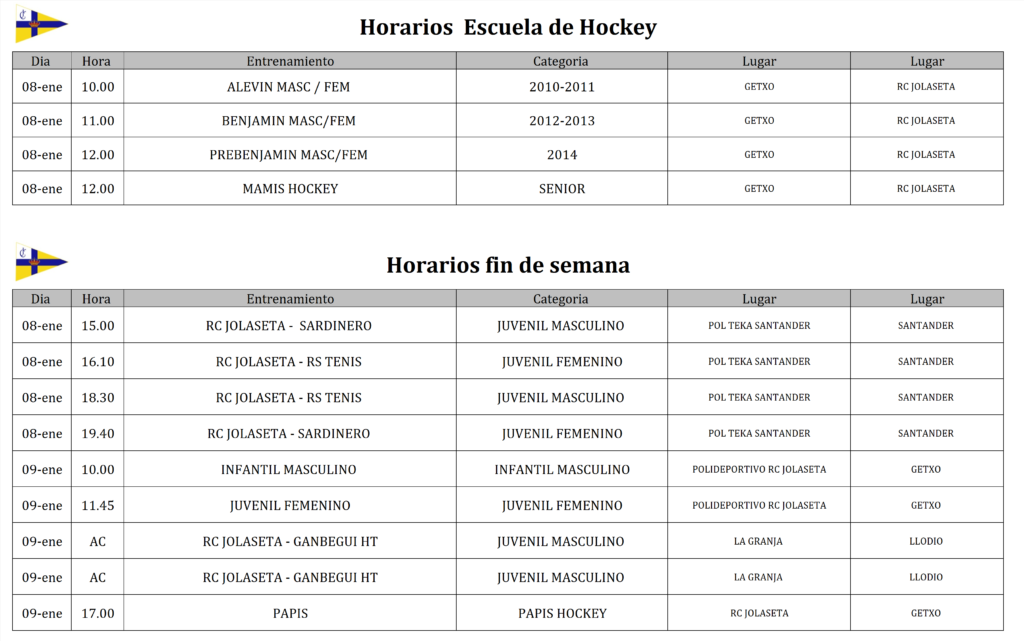 Les informamos a continuación de los horarios de la escuela de hockey hierba para el fin de semana del 8 y 9 de enero.