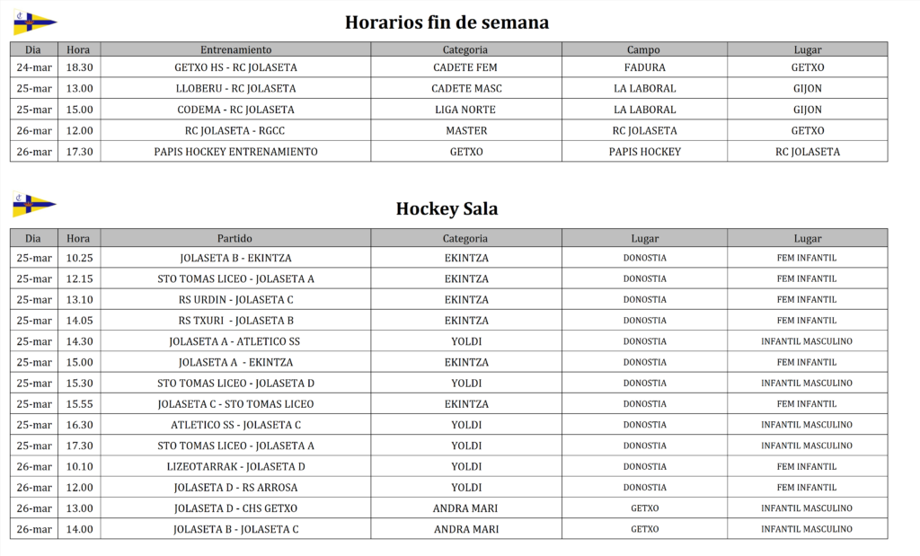 Las chicas de hockey sala de la categoría Infantil Femenino de los equipos Jolaseta A, Jolaseta B y Jolaseta C, saldrán de nuestras instalaciones el sábado 25 de marzo a las 8.30 horas, con un retorno aproximado a las 15.00 horas. Las chicas de la categoría Infantil Femenina de hockey sala del equipo Jolaseta D, saldrán de nuestras instalaciones el domingo 26 de marzo a las 8.15 horas con regreso sobre las 14.20 horas.