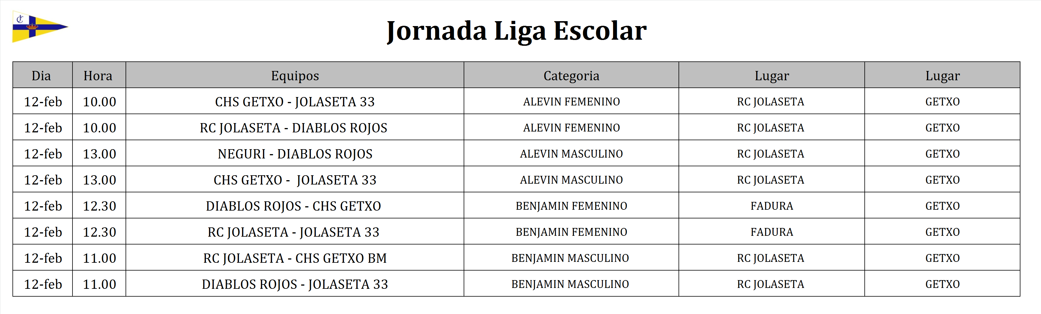 Les rogamos máxima puntualidad para la mejor organización de todas las actividades. Retomamos los partidos de la Liga Escolar, es por eso que los participantes deben estar 15 minutos antes del inicio del partido. La composición de los equipos la encontrará en el tablón del Real Club Jolaseta.
