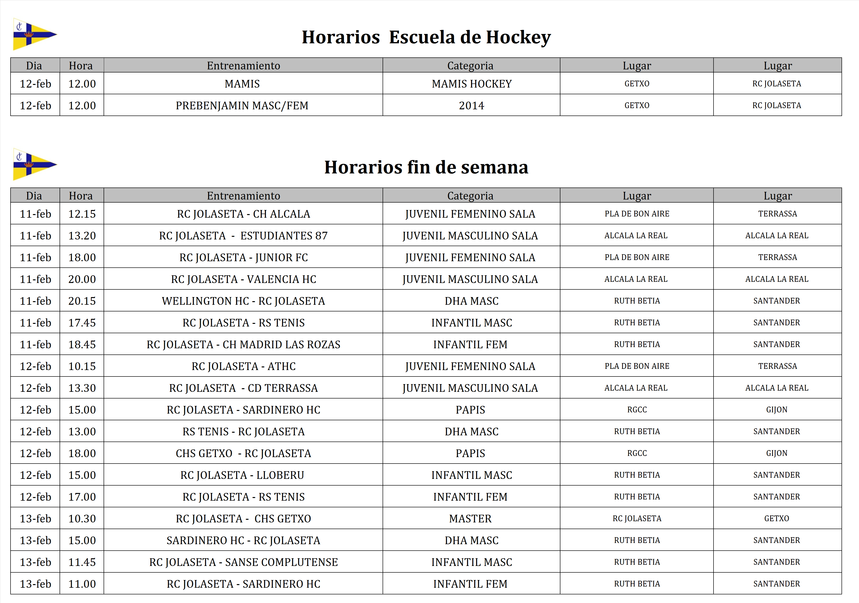 Les informamos a continuación de los horarios de la escuela de hockey hierba para el fin de semana del 12 y 13 de febrero.