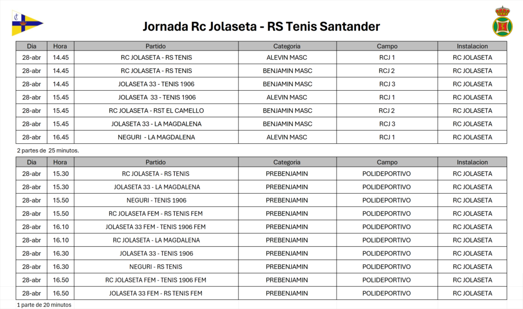 Les informamos de la actividad de escuela que se desarrollará el próximo domingo 28 de abril en nuestras instalaciones con la visita del Tenis de Santander. El club de Santander se desplaza con jugadores de la categoría Prebenjamín Masculino y Femenino, y también con jugadores de categoría Benjamín Masculino y Alevín Masculino. Los partidos iniciarán a la finalización del partido de División de Honor Masculina que enfrenta al Real Club Jolaseta frente al RS Tenis la Magdalena. Rogamos máxima puntualidad para la correcta organización de las actividades y el buen desarrollo de estas.