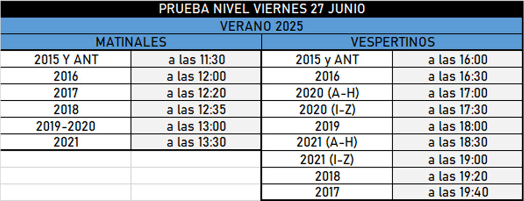 Recordamos a los Socios inscritos a los Cursillos de Natación que este viernes 27 de junio se realizarán las pruebas de nivel. Disponen de los horarios según años de nacimiento.