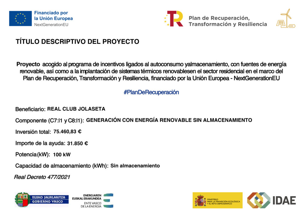 Comunicamos a título informativo a los Socios del Club la concesión de una subvención por parte del Ente Vasco de Energía (EVE) por la instalación de placas fotovoltaicas destinadas a la mejora de la eficiencia energética y la producción de energía para autoconsumo.